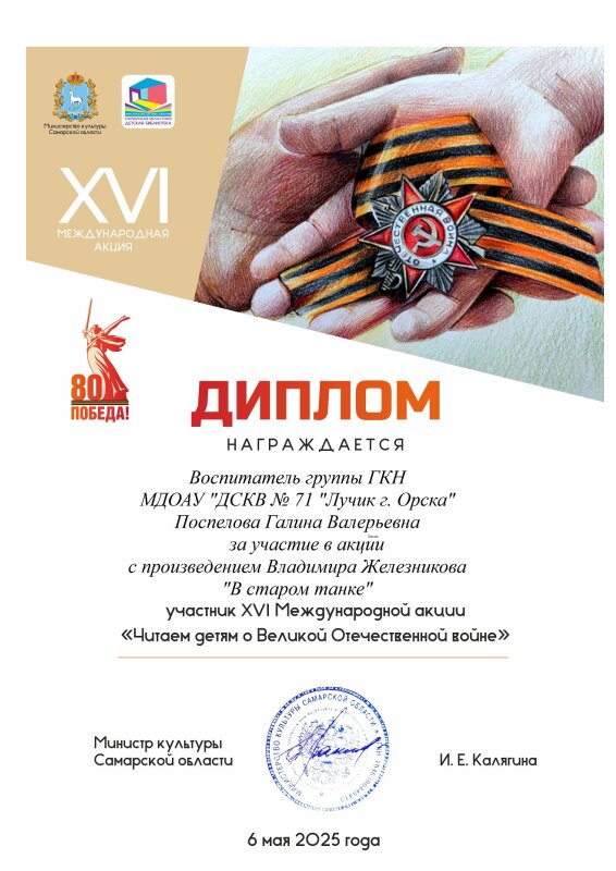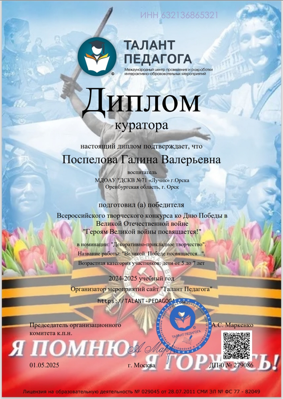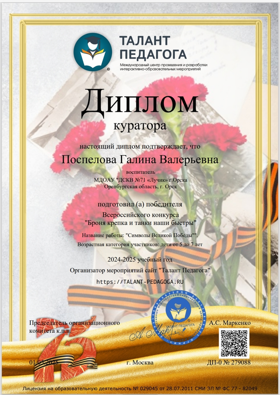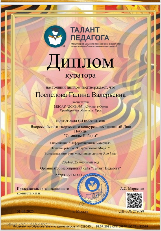 Август 2025 учебный год . РИЦО Диплом Лауреат 1 степени за участие во Всероссийском педагогическом конкурсе "Проектная деятельность с дошкольниками группы ГКН" ". Конкурсная работа "Проект "Огород на окошке"