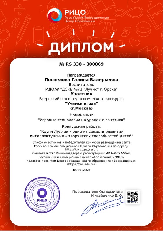 Сентябрь 2025 учебный год . РИЦО Диплом за участие во Всероссийском педагогическом конкурсе "Учимся играя ". Конкурсная работа "Круги Луллия -одно из средств развития интеллектуально-творческих способностей детей" "