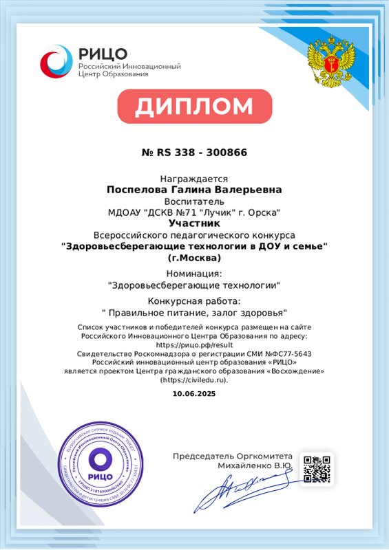 Июнь 2025 учебный год . РИЦО Диплом за участие во Всероссийском педагогическом конкурсе "Здоровьесберегающие технологии в ДОУ и семье". Конкурсная работа "Правильное питание, залог здоровья"